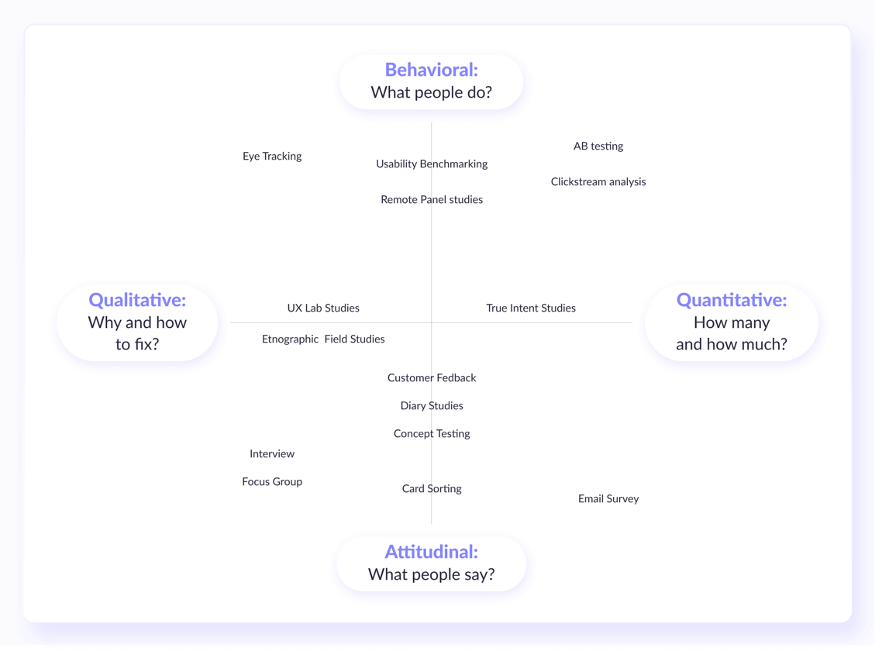 The difference between attitudinal and behavioural can be outlined as: what does the user say, and what does the user do. However, the two are often still very different. The form of attitudinal research focuses very much on understanding standards and norms of a user. Normally, most of research is based on behavioural research, but certain methods bring out the attitudinal part. Research methods that can provide useful insights in both spectrums are: